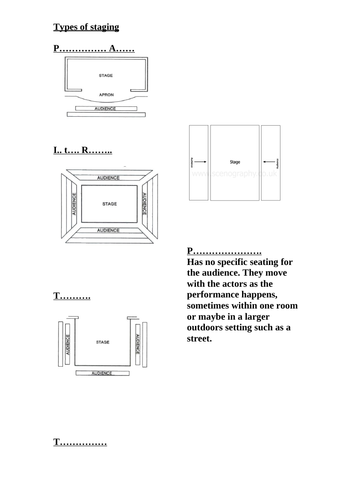 Parts of the Stage - Diagram and Quiz/Worksheet A labeled diagram of a proscenium stage, as well as an identical fill-in-the-blank worksheet. Use in introductory theatre or stagecraft classes as a quiz or bell-ringer. Total Pages. 2 pages. Answer Key. Included. Teaching Duration. N/A. Report this Resource to TpT.