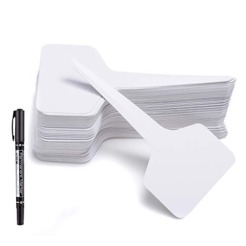 Willkey 100PCS Plastic Plant Labels T Type Markers with A Marker Pen Plant Hanging Tags Markers Garden Markers Waterproof White